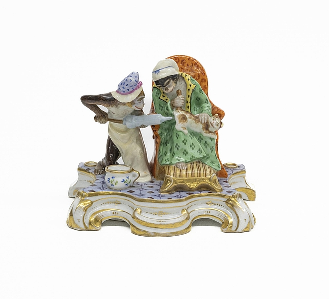 Vorgestellt wird eine fein gearbeitete Porzellanskulptur aus der Zeit um 1860, die das Setzen eines Darmklistiers zum Thema hat–- ein in der Medizingeschichte vertrautes Motiv. Das Besondere: Hier sind keine Personen dargestellt. Vielmehr verabreichen zwei Affen in menschlicher Kleidung einem überrascht blickendem Kätzchen gerade einen Einlauf mit einer großen Klistierspritze. Diese Skulptur gehört damit zur sogenannten „Singerie-Kunst“, bei der Affen wie Menschen auftreten, also deren Kleidung tragen und deren Tätigkeiten ausüben. Vor allem im 17. und 18. Jahrhundert nutzten Künstler diese Darstellungsform, um menschliche Schwächen oder Eitelkeiten zu karikieren. Im 19. Jahrhundert erhielt diese Satire durch die Evolutionstheorie von Charles Darwin eine weitere Bedeutungsebene.