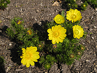 Adonisröschen, Adonis vernalis L. | Das leuchtend gelbe Adonisröschen stammt ursprünglich aus Sibirien und dem Altaigebirge. Die ersten Knospen treiben im zeitigen Frühjahr, sind grün- violett bereift und fallen deshalb im Winterlaub kaum auf. Bei mildem Wetter findet man die ersten Blüten im März, Hauptblütezeit ist allerdings erst im April/ Mai. Die sattgelben Kronblätter öffnen sich nur bei Sonnenschein. Die Laubblätter sind sehr fein gefiedert und können so die Wärme gut speichern. Nach der Blüte sorgen vor allem Ameisen für die Verbreitung der Samen. Als Steppenpflanze braucht das Adonisröschen wenig Nährstoffe, dafür aber sehr viel Licht.