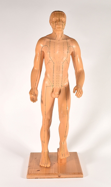 Im Jahr 2023 übernahm das DMMI die umfangreiche Privatsammlung des Luxemburger Gynäkologen Dr. Henri Kugener (1943 bis 2022). Als Teil dieser Sammlung gelangte auch das vorgestellte Akupunkturmodell ins DMMI. Das 70 Zentimeter große Kunststoffmodell wurde von dem 1978 gegründeten japanischen Unternehmen Seirin produziert, das für die Herstellung von Akupunkturnadeln bekannt ist. Auf der Oberfläche des Modells sind farbig die zwölf Hauptleitbahnen sowie das Zentral- und das Lenkergefäß dargestellt. Gemäß der Traditionellen Chinesischen Medizin (TCM) zirkuliert in diesen Leitbahnen das Qi (Lebenskraft) durch den Körper. Wird der Fluss des Qi gestört, sind Beschwerden und Krankheiten die Folge. Durch das Einstechen von Nadeln an definierten Akupunkturpunkten soll der Fluss des Qi wieder ins Gleichgewicht gebracht werden. In diesem Modell sind die 361 klassischen Akupunkturpunkte dargestellt und entsprechend der Nomenklatur bezeichnet, die in den 1980er-Jahren von der WHO ausgearbeitet wurde [1].